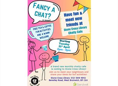 A brand new monthly chatty cafe is coming to Stone Cross Library! Join us to meet your neighbours and share your ideas for fun activities! Light refreshments provided. Every 3rd Tuesday of the month starting on Tuesday 21st April 2pm-4pm